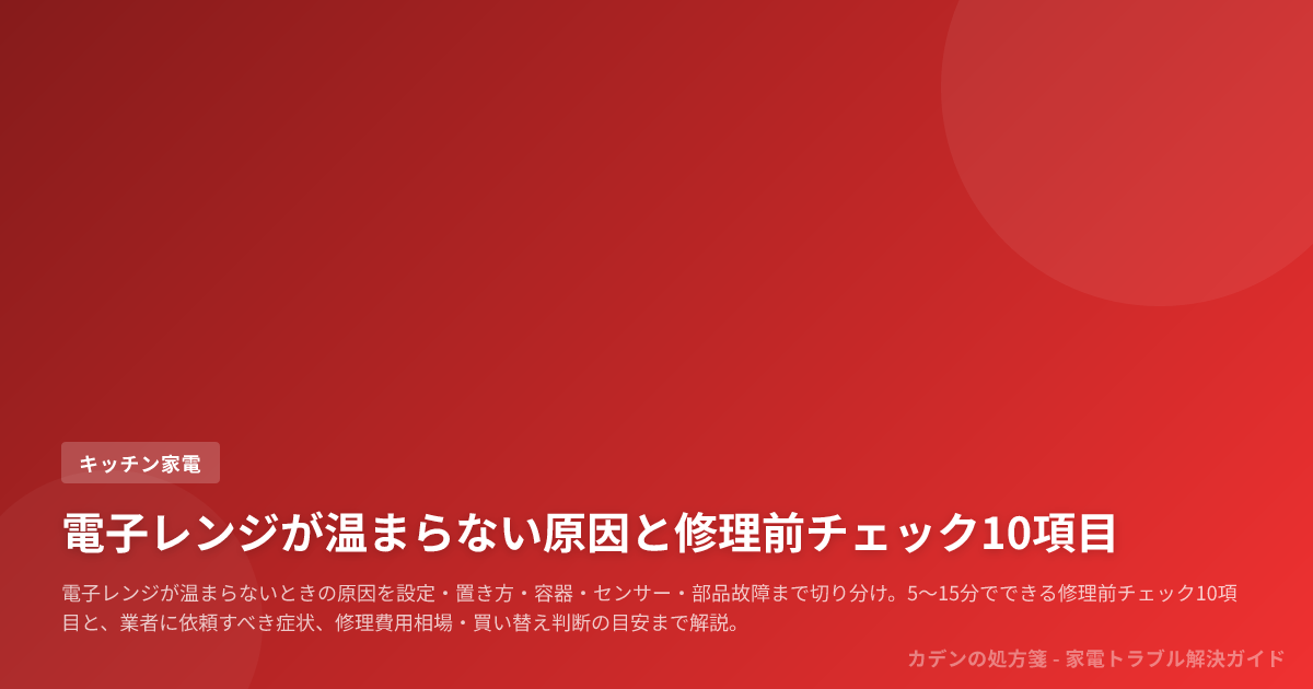 最初に手動600Wでコップ1杯の水を1分温めて基礎加熱の可否を見てから、出力モード、容器、置き方、センサー、経年劣化、マグネトロンやインバーター、基板の可能性まで、家庭で判断できる範囲を順に整理します。