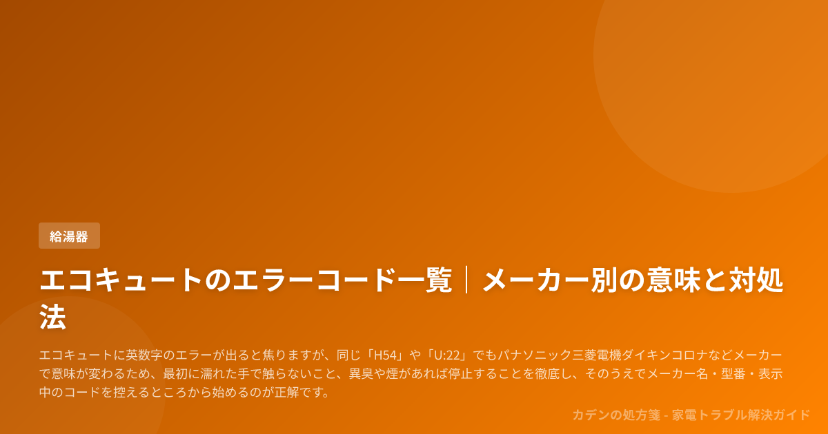 エコキュートに英数字のエラーが出ると焦りますが、同じ「H54」や「U:22」でもパナソニック三菱電機ダイキンコロナなどメーカーで意味が変わるため、最初に濡れた手で触らないこと、異臭や煙があれば停止することを徹底し、そのうえでメーカー名・型番・表示中のコードを控えるところから始めるのが正解です。