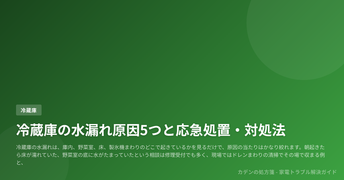 この記事では、最初の5分でやるべき感電防止・床被害の回避・止水確認・記録を短いチェックリストで整理したうえで、水漏れ箇所からドレン、ドレンパン、ドアパッキン、給水、霜取り・コンプレッサーの5系統へ切り分ける道筋を示します。