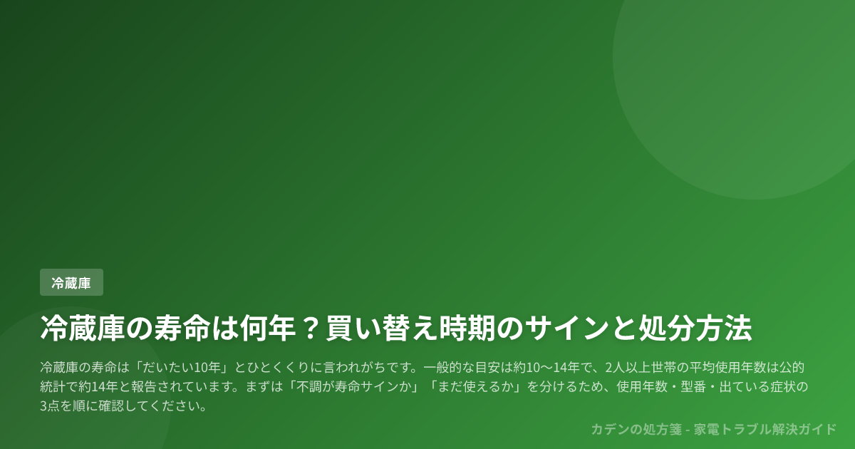 まず、家庭用冷蔵庫の一般的な使用寿命の目安は約10〜14年です。