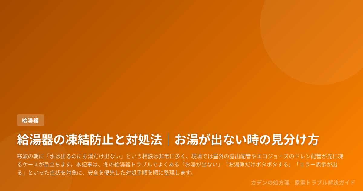 本記事は、冬の給湯器トラブルでよくある「お湯が出ない」「お湯側だけポタポタする」「エラー表示が出る」といった症状を対象に、安全を優先した対処手順を順に整理します。