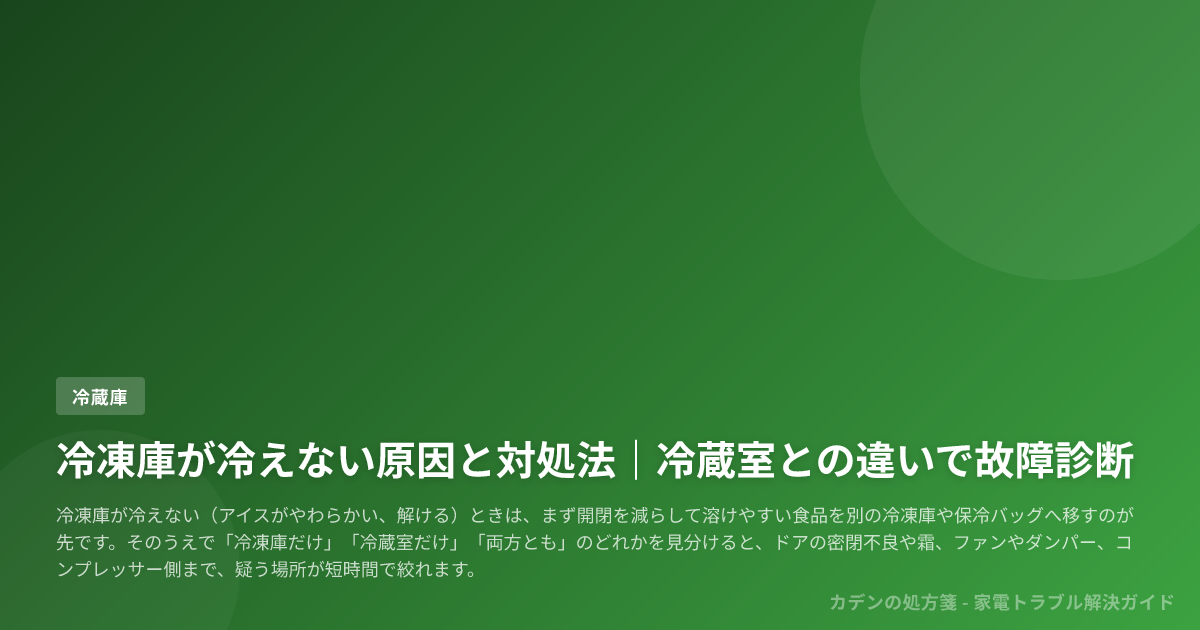 冷凍庫が冷えない(アイスがやわらかい、解ける)ときは、まず開閉を減らして溶けやすい食品を別の冷凍庫や保冷バッグへ移すのが先です。