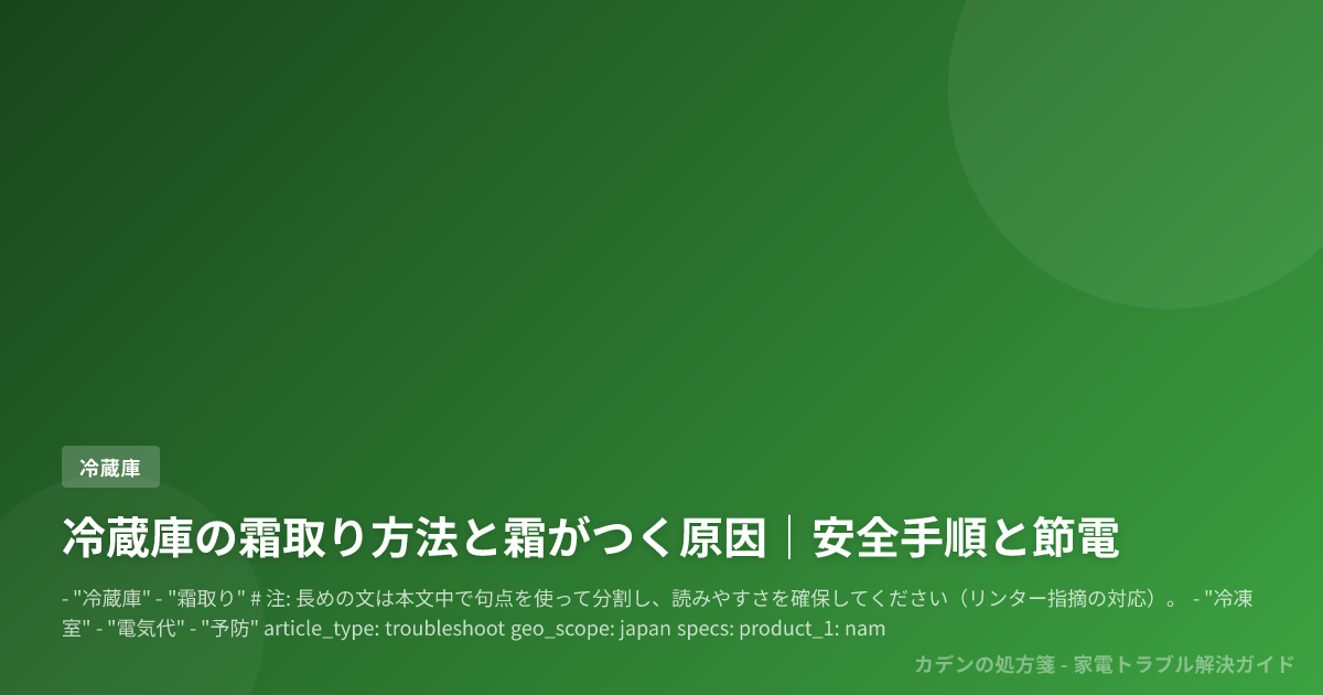 • "予防" article_type: troubleshoot geo_scope: japan specs: product_1: name: "直冷式" key_features: "構造がシンプルで電気代は比較的低めだが、霜がつきやすく手動霜取りが必要" product_2: name: "ファン式(間接冷却)" key_features: "自動霜取りが一般的で霜対策は楽だが、ファンや機能分だけ消費電力がやや高くなる傾向" product_3: name: "正常な一時的な霜" key_features: "ドア開閉や湿度上昇で発生しうる。軽度ならセルフ対処可能" product_4: name: "異常な霜" key_features: "パッキン破損・半ドア・性能低下・除霜不良などが疑われ、再発性が高い" product_5: name: "薄い霜への対処" key_features: "ぬるま湯タオル中心" product_6: name: "厚い霜への対処" key_features: "電源停止後の自然解凍+樹脂ヘラで補助" 冷蔵庫の霜取りは、まず自宅の機種が直冷式かファン式(間接冷却)かを見分けるところから始めると迷いません。Panasonicの案内でも直冷式は手動の霜取りが必要で、ファン式は自動霜取りを採用している機種が多いとされています。